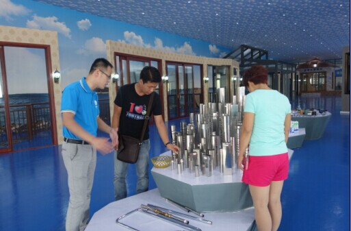 (石副總在全國(guó)最大的門(mén)窗體驗(yàn)中心向貴賓介紹奮安不銹鋼產(chǎn)品)